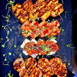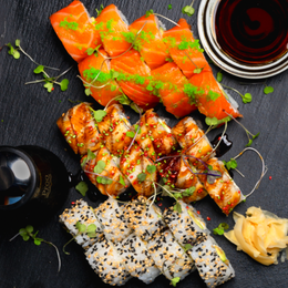 Rollo Salmon Teriyaki con Sesamo 4pzs, Rollo Salmo Teriyaki con Pepino 4pzs,Philadelphia Classic 4pzs, Philadelphia Anguila 4pzs, Nigiri Salmon 4pzs, Ensalada Wakame x2