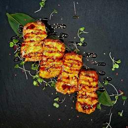 Gamba frita, salmón teriyaki, pepino, queso crema, tobiko y arroz