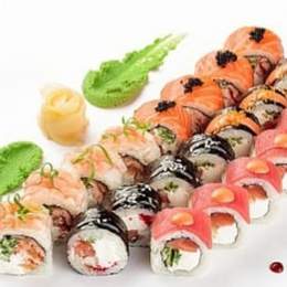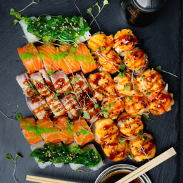 Rollo Sake Unagi 8pzs, Hot Salmon 4pzs, Hot Kani Chees 4pzs, Tempura Salmon 4pzs, Tempura Kani 4 pza, Sweet Roll 16 pzs, Wakame Salad