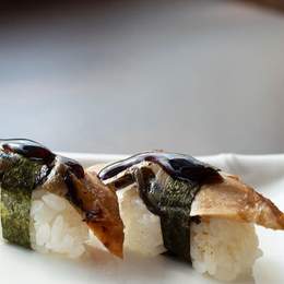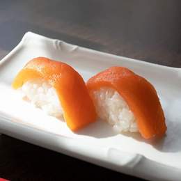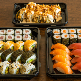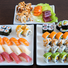 Niguiri salmón (4 u), niguiri atún (4 u), California salmón roll (4 u), California tobiko (4 u), maki atún (8 u), maki salmón (8 u),