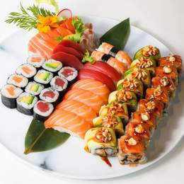 Maki aguacate (4 pzs.), maki salmón (4 pzs.), maki atún (4 pzs.), nigiri salmón (4 pzs.), uramaki rollo tigre (8 pzs.), uramaki rollo ángel (8 pzs.), nigiri gambas (2 pzs.), sashimi salmón (6 pzs.), sashimi atún (3 pzs.), sashimi lubina (3 pzs.
