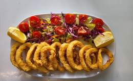 Anillas de calamar rebozadas y fritas, presentando un exterior crujiente e interior suave, un clásico irresistible