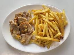 Pan tradicional portugués, filetes de lomo marinado al ajillo y aceite oliva