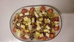 Bacalao y jamón acompañadas con ensalada mediterránea