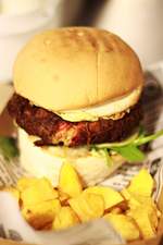 Ternera 100% extremeña (200 g.), salsa de queso, queso, pan casero y patatas fritas