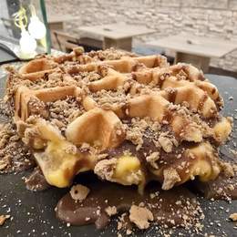 Nuestro Gofre casero relleno de crema pastelera, bañado con chocolate caliente y espolvoreado con virutas de galleta..