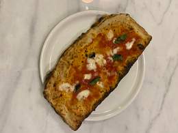 Salsa di pomodoro , mozzarella di bufala campana D.O.P, parmigiano reggiano 24 mesi, olio evo D.O.P pregio e basilico