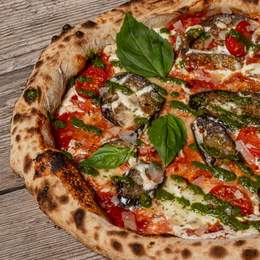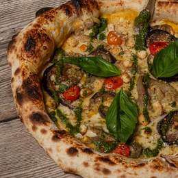 Mozzarella, scamorza, berenjena asada, porchetta, salsa de mostaza y romero.
