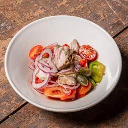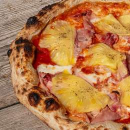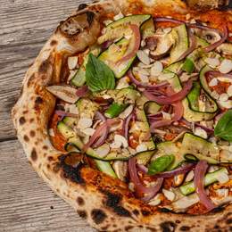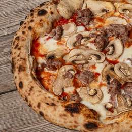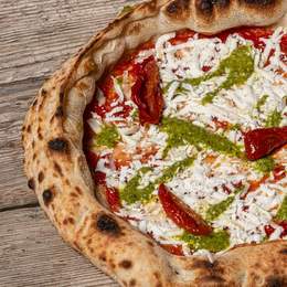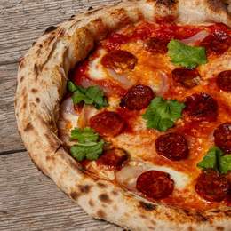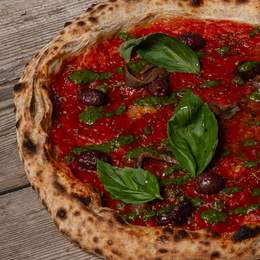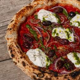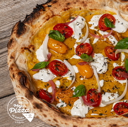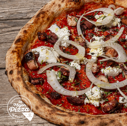 Base de tomate, sobrasada, pulpo, olivas kalamata, aceite de ajo, fior di latte, orégano, tomillo, romero, hinojo, ralladura de lima y aceite de oliva.