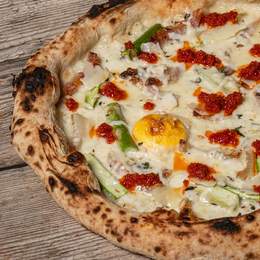 Mozzarella, espárragos, guanciale, scamorza, dos huevos, pecorino, pesto de tomate seco, tomillo, sal y pimienta