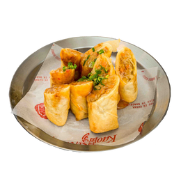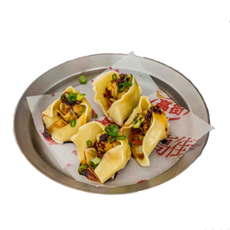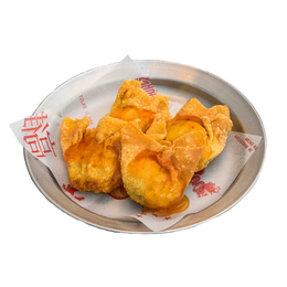 Pasta wantón muy crujiente, rellena de carne y gambas. Con nuestra salsa casera.