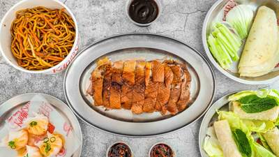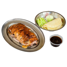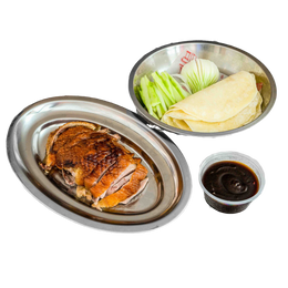 Un cuarto de Pato Pekin según receta tradicional, sello de Familia Kao. Lo servimos con cebolla tierna, pepino, salsa hoisin y obleas caseras hechas a mano.