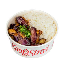Láminas de berenjenas salteadas al wok con nuestra salsa casera. Las servimos con arroz blanco