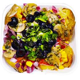 Patata al horno con champiñones, maíz, cebolla cruda, aceitunas y tomate fresco