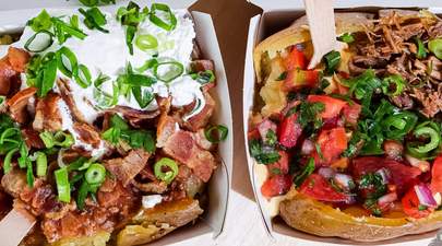 Espectacular nueva receta de patata rellena con queso cheddar fundido, maíz, cebolla y trocitos de pollo frito
