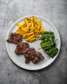 Un clásico para los amantes de la carne, acompañado de patatas y pimientos del padrón.