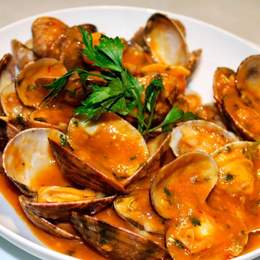Almejas y salsa verde hecha de ajo, perejil, vino blanco y caldo de pescado.