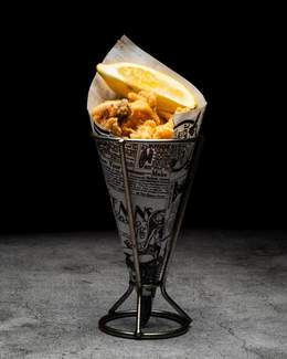 Calamares en rodajas, rebozados al estilo andaluz y bien fritos.