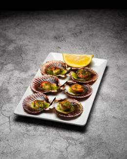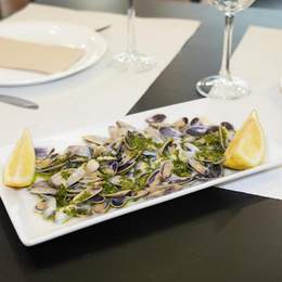 La Mariscada está compuesta por almejas, mejillones, zamburiñas, gambas, navajas y calamar. Todo cocinado a la plancha y aliñado con aceite, ajo y perejil.