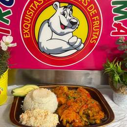 Carne de res bañada en salsa criolla con patatas cocidas, yuca, arroz y ensalada dulce