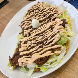 Combinado de salchicha con patatas, lechuga picada, queso rallado, huevos de codorniz y salsa rosa