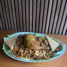 Excelente combinado de costilla ahumada en trozos, chicharrón picado, chorizo, plátano picado en pedacitos mezclado con verduras y arroz