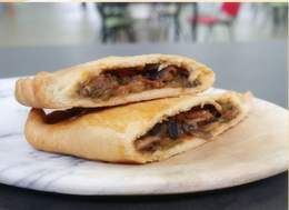 Deliciosa empanadilla al estilo burger, con proteína de soja, queso vegano estilo cheddar, mostaza y mezcla especial de especias