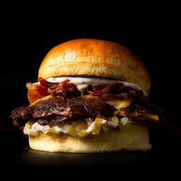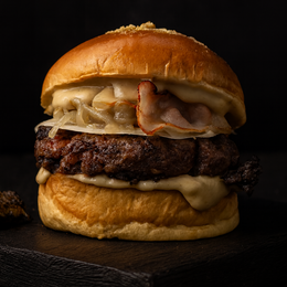 Brioche de patata sellado, relleno de 90g de carne de txuleta madurada, queso cheddar, queso mozzarella y salsa O.V.N.I.