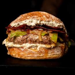 Carne de txuleta, bacon, cheddar, monterrey, pepinillo picado, cebolla frita y salsa emmy casera (picante).