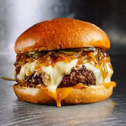 Carne picada 100% de ternera a la barbacoa cubierta de queso fundido Monterrey, cebolla caramelizada, pepinillos encurtidos y nuestro nuevo aderezo Melt.