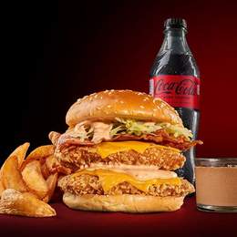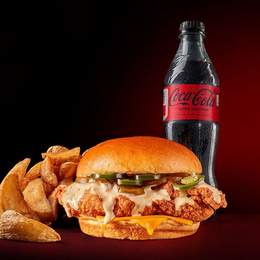 Hamburguesa de pollo crujiente, salsa 50 Burger Spread, queso americano, bacon, lechuga, con patatas, bebida, salsa 50 Burger Spread y acompañada de una ración de Tequeños.