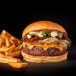 Doble smash burger con queso mozzarella ahumado, tomate seco confitado, rúcula y Mayo Albahaca. Acompañada de patatas y salsa Mayo Albahaca.