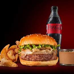 Una receta clásica de toda la vida. Hamburguesa con queso americano, cebolla morada a la plancha, tomate, lechuga, pepinillos, salsa Barbacoa Goiko y salsa Mayo Goiko. Acompañada de patatas y salsa Barbacoa Goiko.