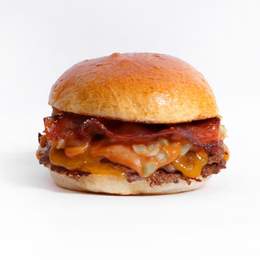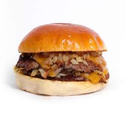 Doble smash burger de 180gr. de carne de vaca vieja con cebolla caramelizada, bacon ahumado caramelizado, cheddar fundido, nuestra salsa Emmy a base de pimientos coreanos con sésamo con el toque justo de picante, y pan brioche.