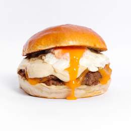 Doble smash burger 180gr. de carne de vaca vieja, huevo frito, salsa de trufa, bacon bits, cheddar y pan brioche.