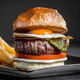 Pan brioche, mayonesa trufada, carne (180gr.) queso cheddar y huevo frito