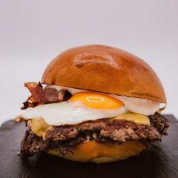 Bacón, huevo y mayonesa de jabuguito. 2 discos (100 g.) de carne picada con queso cheddar hecha al estilo smash que consigue una carne fina, jugosa por dentro y crujiente por fuera. Pan brioche de La Cremita de Daniel Ramos