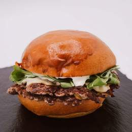 Queso ahumado, tomate seco confitado,mayo-citrica y rúcula. 2 discos de (100 g.) de carne picada con queso cheddar hecha al estilo smash que consigue una carne fina, jugosa por dentro y crujiente por fuera. En pan brioche de la cremita de Dani Ramos