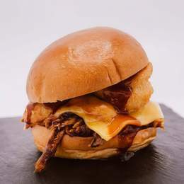 Pulled pork de cerdo ibérico, aros de cebolla fritos, salsa bbq y queso cheddar con pan brioche