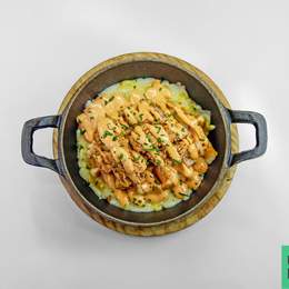 Pulled pork, patatas fritas horneadas con mezcla de quesos y crema de salsa ranchera