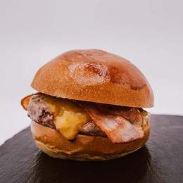 Cebolla pochada, bacón y salsa bbq, 2 discos (100 g.) de carne picada con queso cheddar hecha al estilo smash que consigue una carne fina, jugosa por dentro y crujiente por fuera. En pan brioche de La Cremita de Daniel Ramos