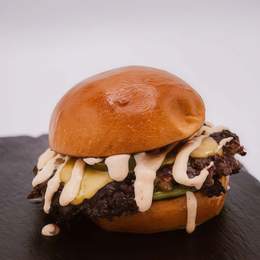 Guacamole, jalapeño y mayo chipotle. 2 discos de (100 g.) de carne picada con queso cheddar hecha alestilo smash que consigue una carne fina, jugosa por dentro y crujiente por fuera. En pan brioche de la cremita de Dani Ramos
