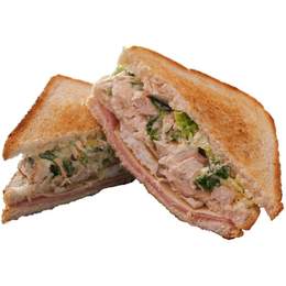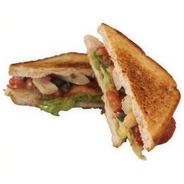 Pechuga de pollo, lechuga, mayonesa, jamón, queso, bacón y huevo entre tres deliciosos panes tostados a la plancha