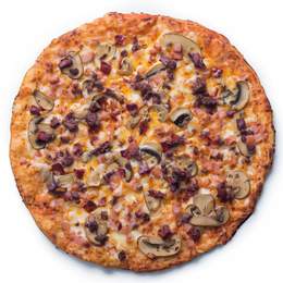 Nunca sobra una porción para el desayuno. Nuestra masa tradicional, base de salsa de nata, mix de queso Tabita’s, champiñones, bacon y una pizca de orégano
