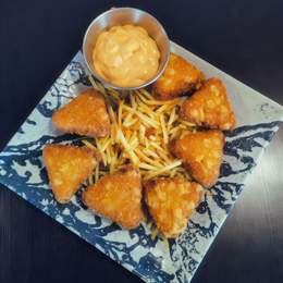 Surtido para 4 personas de triángulos de queso, croquetas, lagrimitas, alitas fritas y aros de cebolla. Con salsa mayo kimchi y patatas paja. Alérgenos: gluten, lactosa, soja, huevo, apio y mostaza