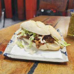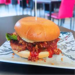 Con pan brioche, hamburguesa vegana casera, pimiento a la plancha, cebolla crunchy y salsa brava. Alérgenos: gluten, soja y cacahuetes