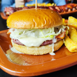 Con pan mollete, carne de ternera y cerdo, queso, lechuga, huevo a la plancha, bacon y salsa roquefort. Alérgenos: lactosa, huevo, sulfitos y gluten (carne ternera y cerdo). Las hamburguesas no vienen con patatas de guarnición