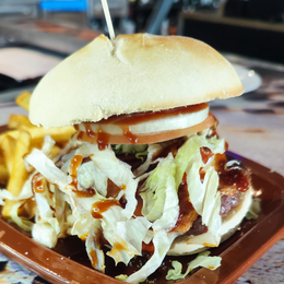 Con patatas paja y salsa BBQ. Alérgenos: gluten y huevo