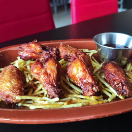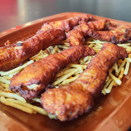 Con la salsa especial casera Rock & Wheels a base de tomate, pollo, pimiento y cebolla. Con un toque picante.