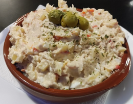 Ensaladilla tradicional hecha de forma casera con patatas, huevo, mayonesa y atún, con aceitunas para coronar el plato. Alérgenos: huevo y pescado